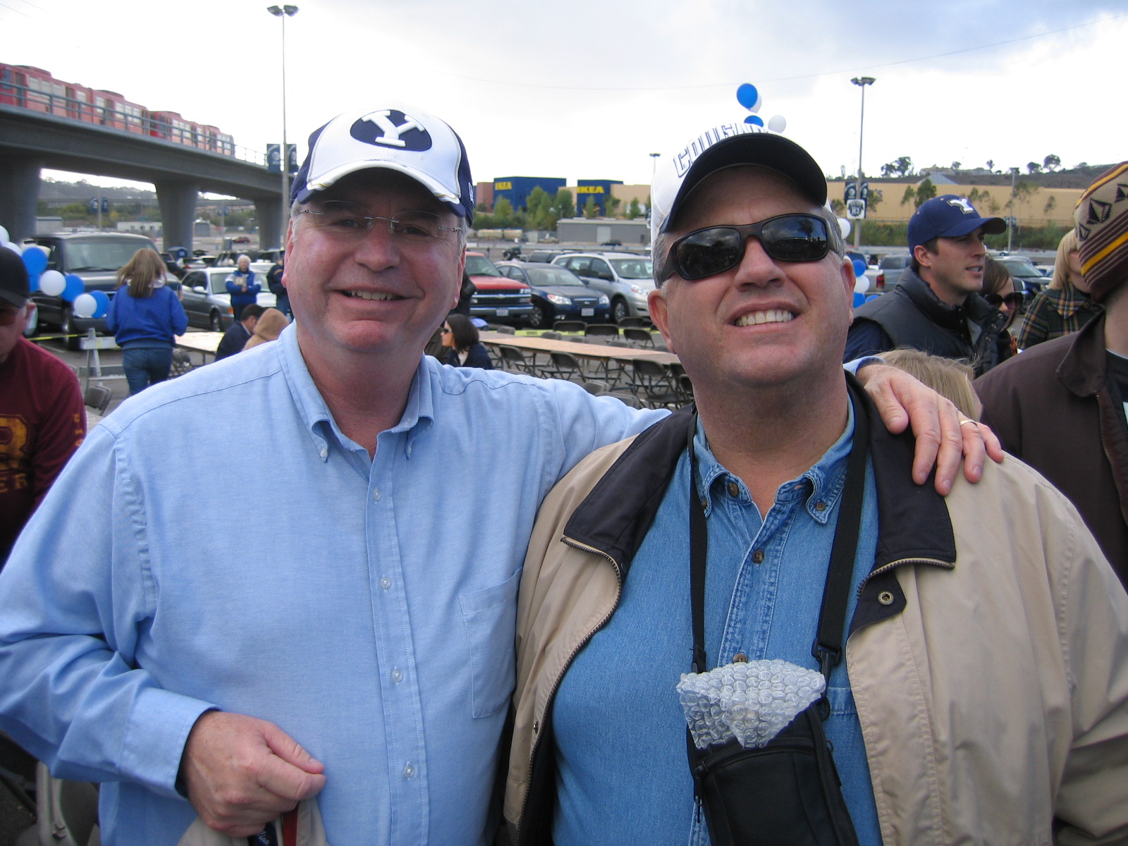 With our good friend Cosmo. I think I look a little bit too happyToday Mel and I, and Tyler and Anna, went to San Diego to see the BYU vs. San Diego state football game. And we WON. We also went to the tail gate party and ran into my cousin Sandra and her family, and Grant, from our ward. He and Mel have been fans of BYU football for a long time. We enjoyed the food and entertainment, until it started raining on us. Thank heavens that didn't last for long. But here are a few pictures of some wild and crazy BYU fans.